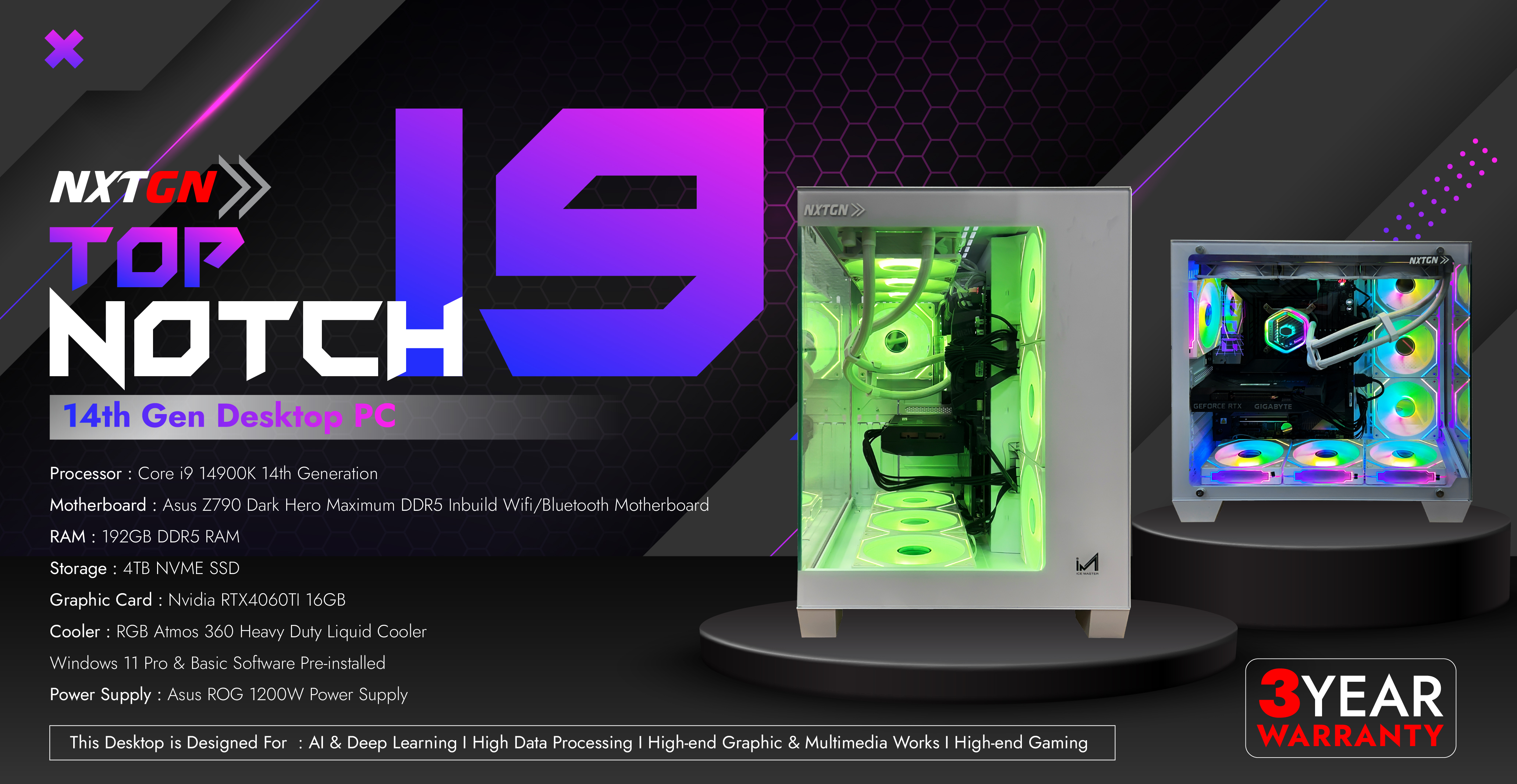 NXTGN TopNotch i9 14th Gen Desktop PC - Core i9 14900K, 192GB DDR5 RAM, 4TB NVMe SSD, Nvidia RTX 34060TI 16GB, Liquid Cooling, Windows 11 Pro - AI, Deep Learning, High-End Gaming & Multimedia